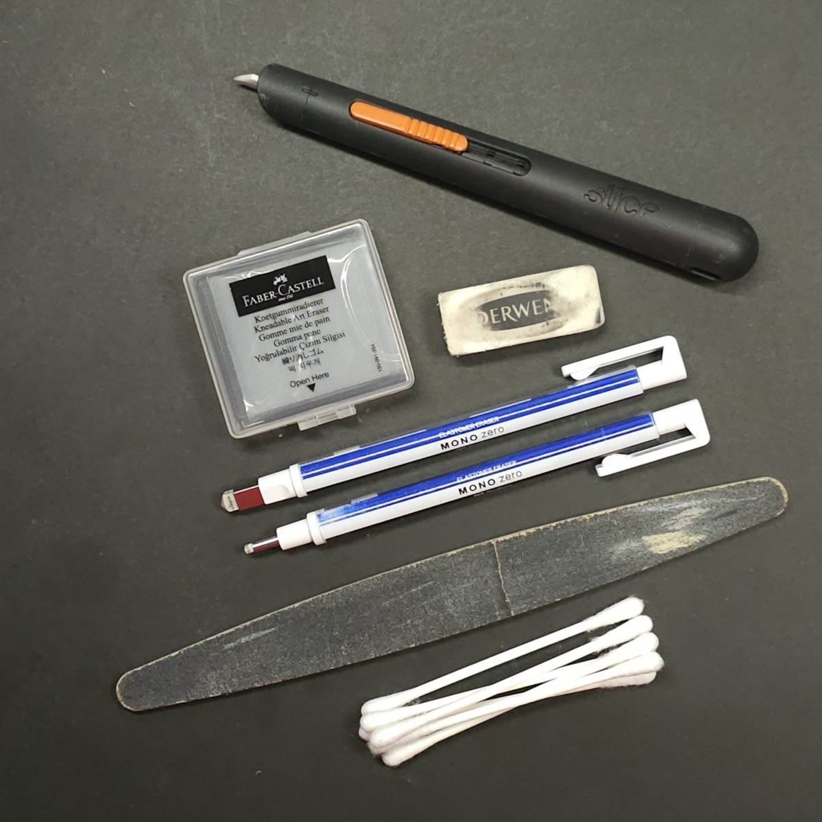 Blusher brush, to flick off scraps of eraser. DO NOT use on soft pastels, or you will find that you need to start over.